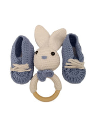 Crocheted Teether with Wooden Ring:Material: The teether is made from soft, baby-friendly yarn, carefully selected for its safety and durabilityDesign: The teether features an adorable crocheted bunny shape, that is sure to capture your baby's attentionWooden Ring: The teether is attached to a wooden ring, which provides a natural and soothing texture for teething babies to chew onSafety: The wooden ring is smooth and free from any harmful chemicals, ensuring it is safe for your baby to useCrocheted Baby Booties:Material: The booties are handcrafted using high-quality yarn, known for its softness and gentle touch on your baby's delicate skinComfortable Fit: The booties are designed to provide a snug and comfortable fit, keeping your baby's feet cozy and warmEasy to Wear: They have a slip-on style and secure strap closures, making it convenient for you to put them on and take them off your baby's feetSize Range: The booties come in a special universal size to fit into your baby's tiny feet even when wearing socks or onesieProduct Dimension (cm):